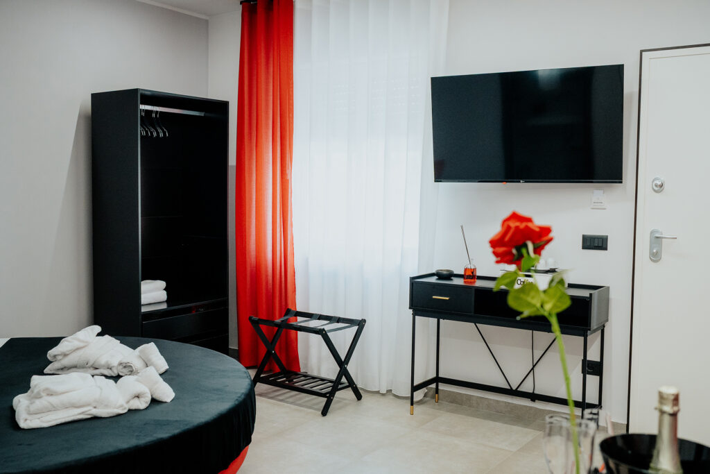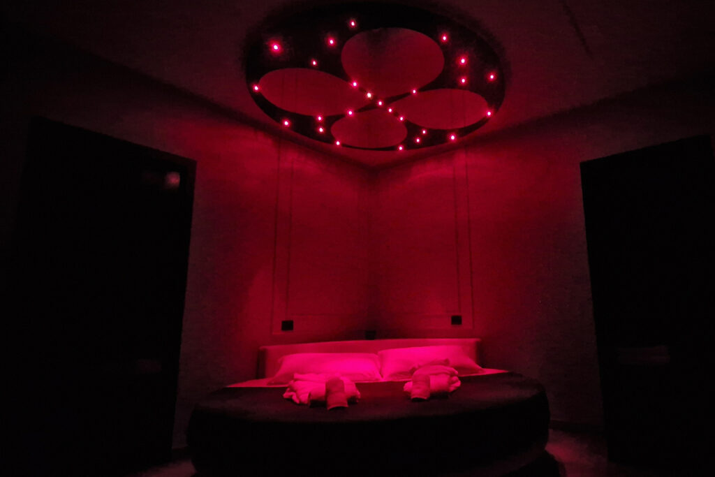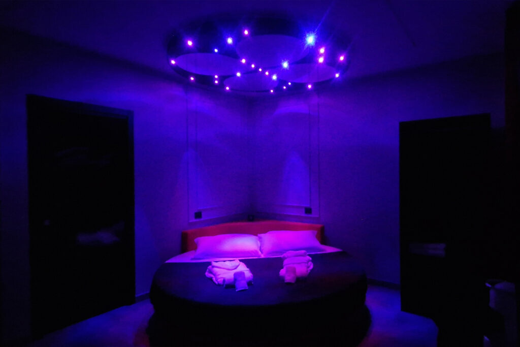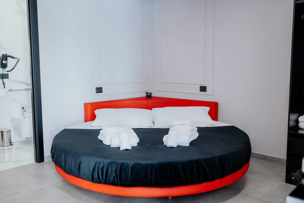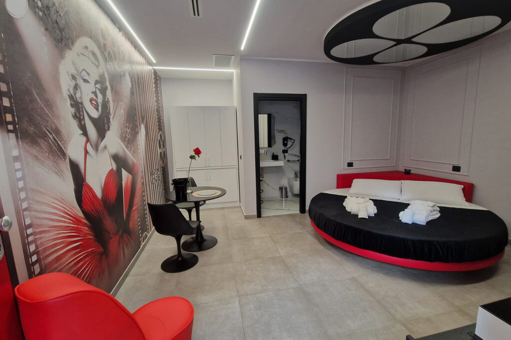Appena varcata la soglia, vi accoglierà un’ambientazione da set cinematografico: un’ampia parete raffigurante Marilyn in una delle sue iconiche pose domina la stanza, mentre un maestoso letto rotondo al centro invita al relax più totale. Le luci soffuse e le gocce di specchio sospese al soffitto creano riflessi avvolgenti che renderanno ogni momento indimenticabile.
