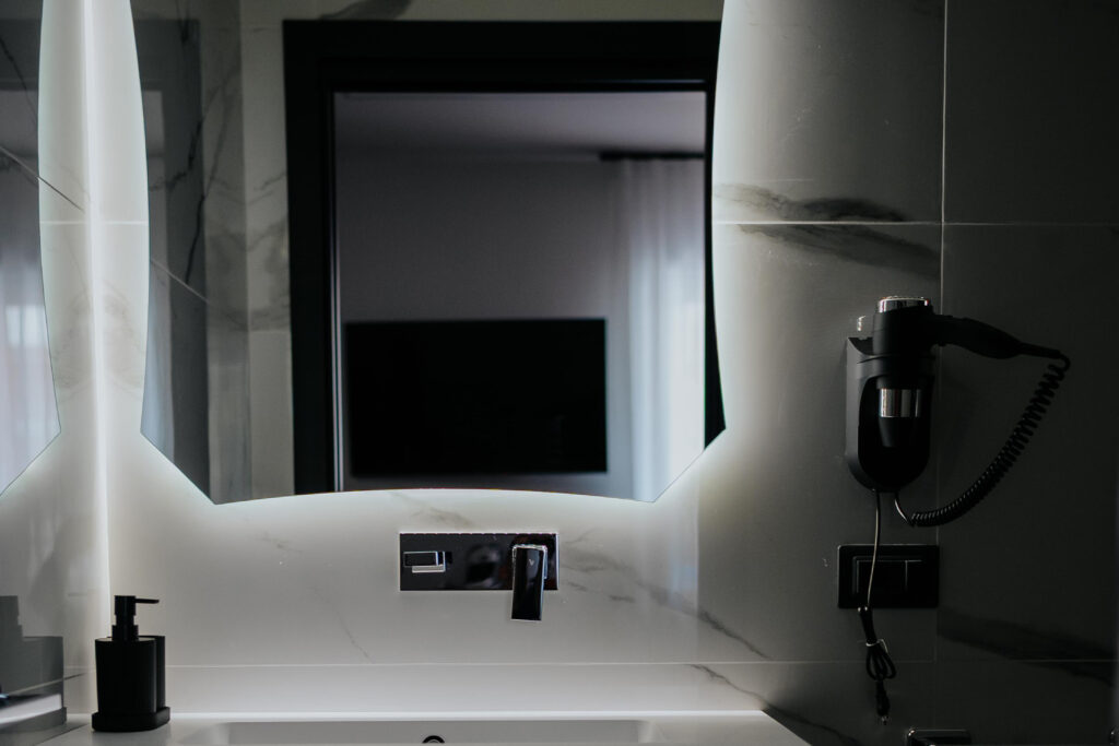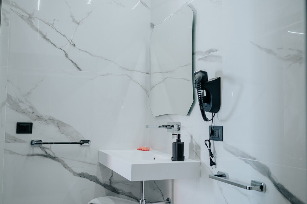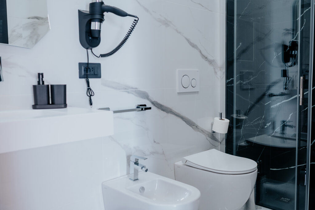 Il bagno privato, in stile marmo effetto spa, è una vera oasi di benessere. La doccia con cromoterapia trasforma ogni momento in un’esperienza rigenerante. Completo di asciugacapelli, accappatoi, set cortesia e set cosmetico, è ideale anche per soggiorni più lunghi.