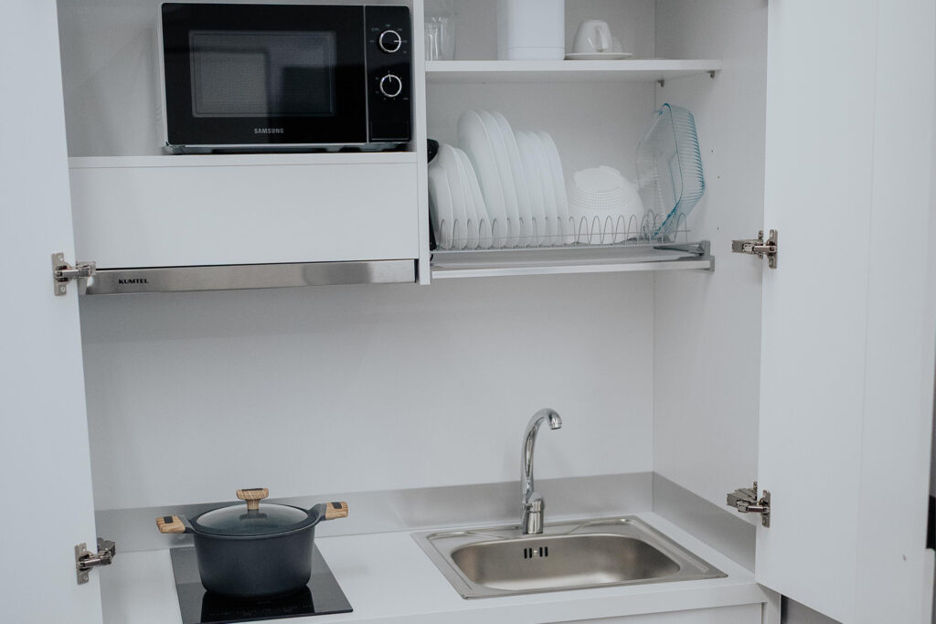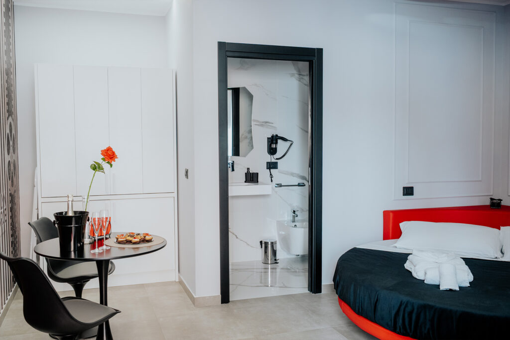 Perfetta come camera romantica per coppie, la stanza Marilyn è anche funzionale per soggiorni prolungati: dispone di un comodo angolo cottura a scomparsa, con elettrodomestici essenziali per preparare pasti in autonomia. Un’opzione versatile per chi cerca una casa vacanza in Calabria dal fascino originale e sofisticato.